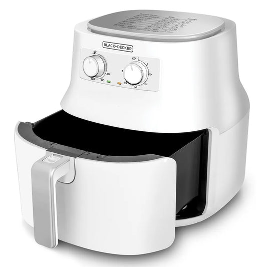 Marca Black and Decker Capacidad 4 Litros Número de Parte HF4004W Apagado automático 30 minutos Temperatura máxima 200 grados centigrados Apto para lavaplatos Si Color Blanco y Negro Cesta Antiadherente...