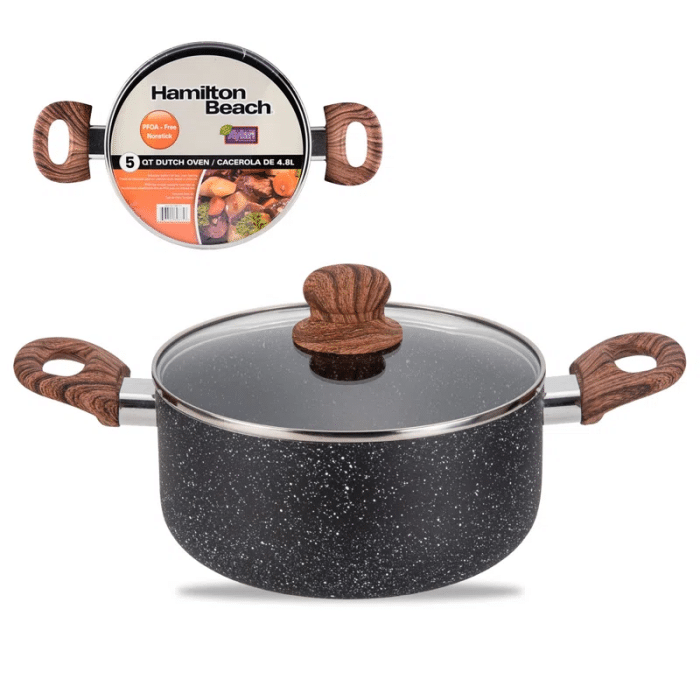 Dutch Oven Hamilton Beach de aluminio de 4.7 litros | 5 cuartos de galón, antiadherente con revestimiento de mármol, mango imitación de madera, fondo de inducción. Antes de usarlo por primera vez lávelo con agua y jabón, enjuague y seque bien. Esto removerá cualquier aceite o residuo del fabricante que pueda estar en la superficie del dutch oven. Para evitar que se raye el interior, no use limpiadores abrasivos que puedan dañar la superficie o utensilios de metal. Use utensilios plásticos, de nylon o de madera. No use en el horno. Nunca deje el dutch oven sin atender en la estufa | cocina. Nunca deje que el contenido del dutch oven se consuma o hierva por completo. Cuando cocine, asegúrese que el mango del dutch oven no sobrepase la orilla de la estufa | cocina. Este un utensilio esencial para cualquier cocina. Hamilton Beach diseña meticulosamente los utensilios de cocina para que se sientan bien en las manos de sus consumidores, estableciendo la confianza para la mejor experiencia culinaria. Esta olla es excepcional para preparar deliciosas sopas, sabrosos guisos, ricas salsas y estofar carne, además de freír, abrasar, escalfar y dorar alimentos a la perfección. La construcción de aluminio de alta calidad distribuye el calor de forma rápida y uniforme por toda la superficie, mientras que la base de inducción es compatible con todo tipo de cocinas. El revestimiento de mármol antiadherente libera los alimentos sin esfuerzo de la batería de cocina para la aventura culinaria más gratificante y hace que la limpieza sea una brisa. Con la eficiente transferencia de calor del aluminio, ahorrará dinero al no necesitar tanta potencia para cocinar los alimentos. UPC: 643700308764 Características: Construcción robusta de aluminio de alta calidad para una larga duración Es compatible con todo tipo de cocinas, incluidas las de gas, inducción, eléctricas, vitrocerámicas y halógenas. El revestimiento de mármol antiadherente no es reactivo y no contiene PFOA para cocinar de forma segura y saludable, al tiempo que libera los alimentos sin esfuerzo Diseño moderno y elegante con asas imitación madera Espesor: 3 mm. Ideal para cocinar pollo, pescado, carne, huevo, vegetales entre otros. Embalaje de manga de color. Aluminio y antiadherente Estadounidense. Capacidad: 4.7 Litros. Dimensiones: 38.7 x 24 x 11.5 cm. Hecho en China. Diseñado en Estados Unidos.