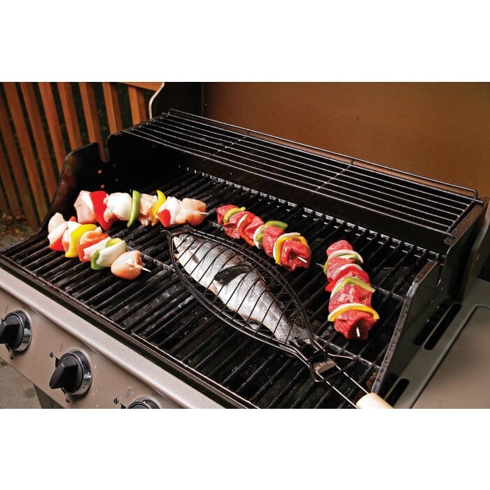 La canasta para asar pescado de Jim Beam, hace que el pescado a la parrilla sea instantáneo. Simplemente prepare el pescado, agregue cualquier condimento o guarnición e insértelo en la canasta. La resistente jaula de metal es fácil de limpiar y evita que los alimentos se peguen a la parrilla. El mango extra largo de madera parawood proporciona un agarre suave y cómodo y extiende su alcance a la parrilla. Es perfecto para usar en el patio trasero de la parrilla o en la hoguera. UPC: 736386801169 Características: Dimensiones: 44.3 cm x 14.7 cm x 3 cm | 17.5" x 5.7" x 1.20" Canasta de metal resistente: no más casos de pescados que se desmoronan en la parrilla o se rasgan cuando es hora de girar. La parrilla de metal evita que los alimentos se peguen a la parrilla. Parrilla uniforme: los espacios de rejilla de tamaño perfecto proporcionan una distribución uniforme del calor. Toda la pieza se asa uniformemente. Volteo fácil: la bisagra de bloqueo mantiene el pescado en su lugar de forma segura, simplemente dé la vuelta a la canasta para asar al otro lado. Mangos de madera extralargos: los mangos para madera extra-largos proporcionan un agarre cómodo y aumentan sustancialmente su alcance en la parrilla. Larga duración y durabilidad: construida con material de primera calidad, esta herramienta promete años de buen uso. Fácil de limpiar: fácil de limpiar y mantener, no se recomienda limpiar el lavavajillas. Hecho en China. Diseñado en Estados Unidos.