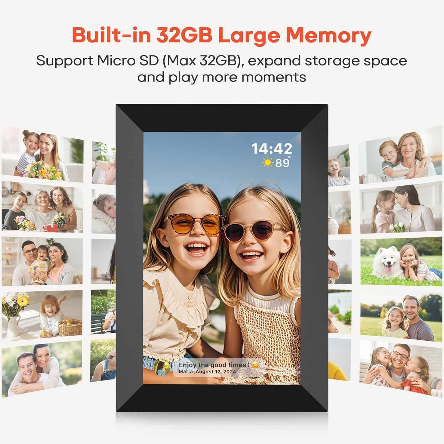 Comparte fotos y videos al instante a través de la aplicación gratuita «Frameo» con tu familia y parejaCaptura cada momento y compártelo al instante con tu familia y pareja. Con el marco de fotos digital para conectar al WiFi, puedes descargar gratis la aplicación «Frameo» para celulares Android o iOS, y luego puedes enviar fotos o videos al marco digital desde cualquier parte del mundo. Memoria incorporada de 16 GB y admite tarjetas SD Mirco de hasta 32 GB, por lo que puedes guardar fotos y pequeños videos en él.