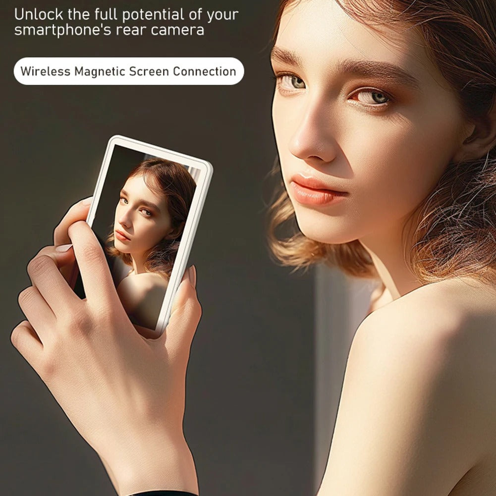 1. Conexión inalámbrica:Esta pantalla magnética para monitor de selfies con pantalla de cámara trasera ofrece una atracción precisa para selfies fluidos en tiempo real en su teléfono inteligente.Disfrute capturando momentos sin problemas con la asistencia de la cámara trasera.